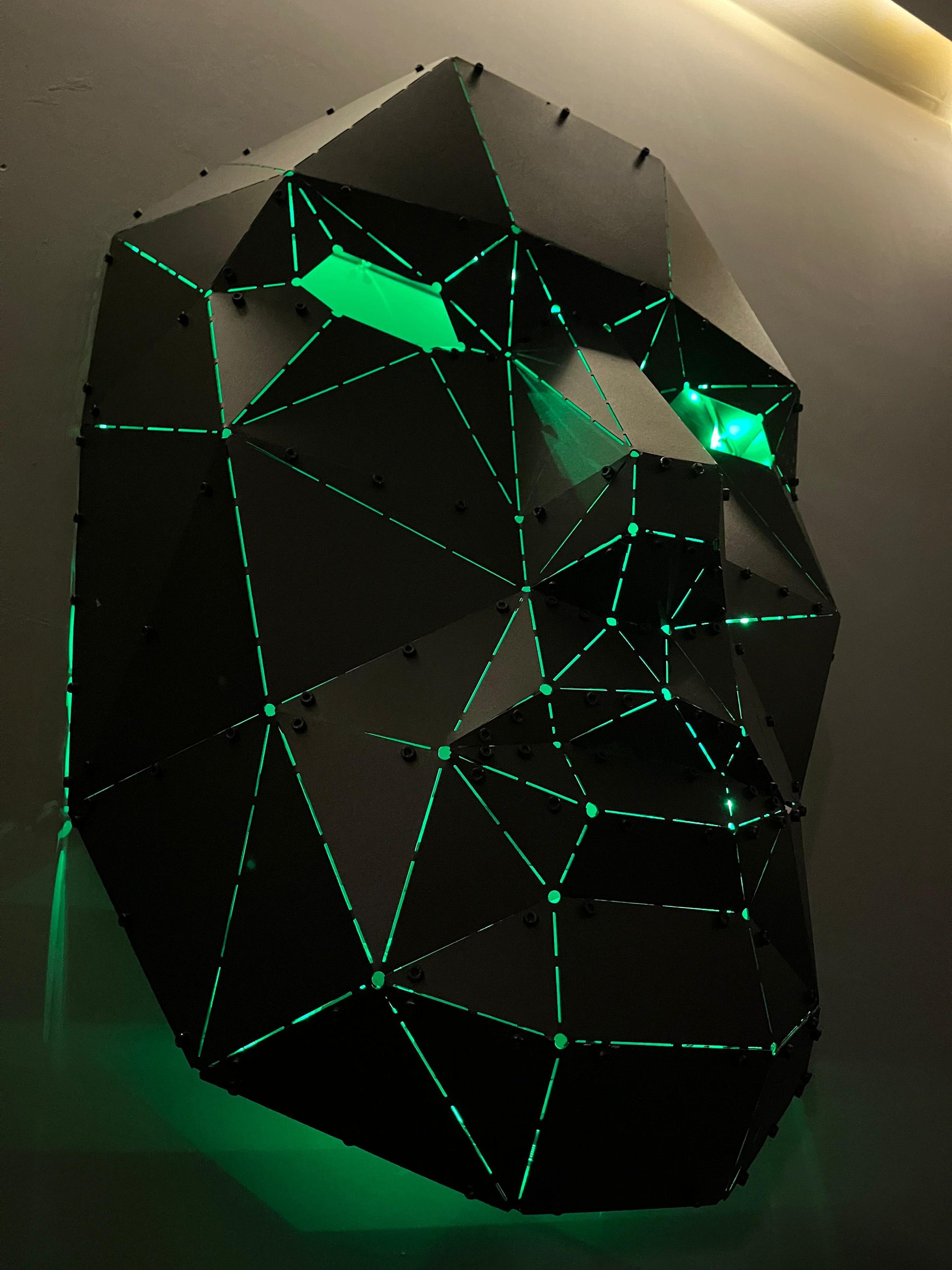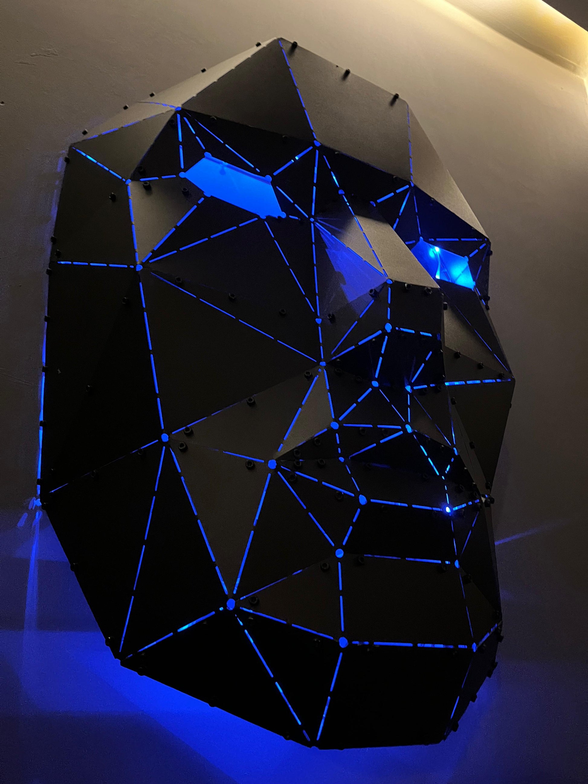This unique geometric face mask combines sharp edges, futuristic lines, and LED lighting to bring a captivating atmosphere to any space. It transforms into a stunning light installation at night, while standing out as a modern art piece during the day.