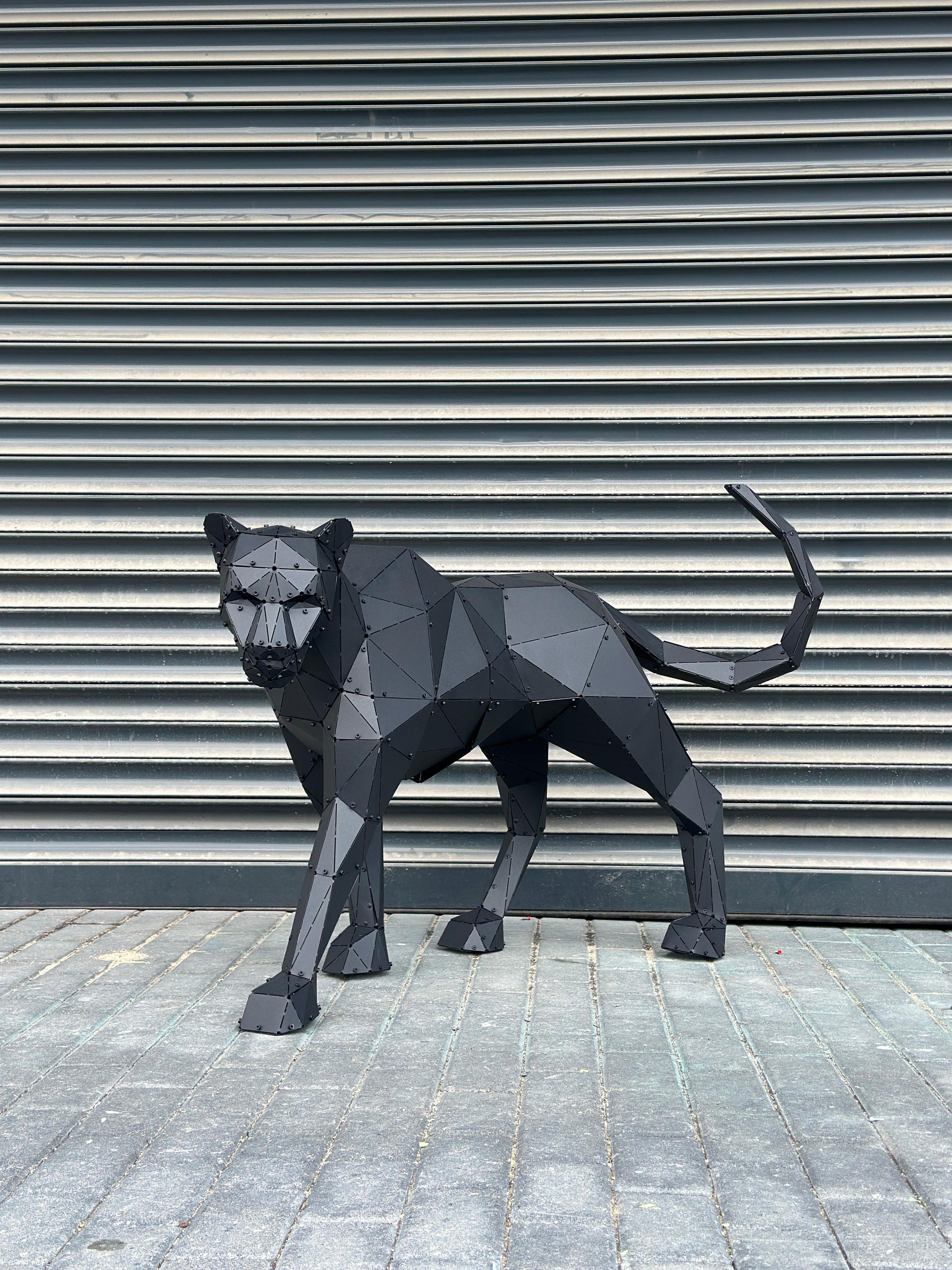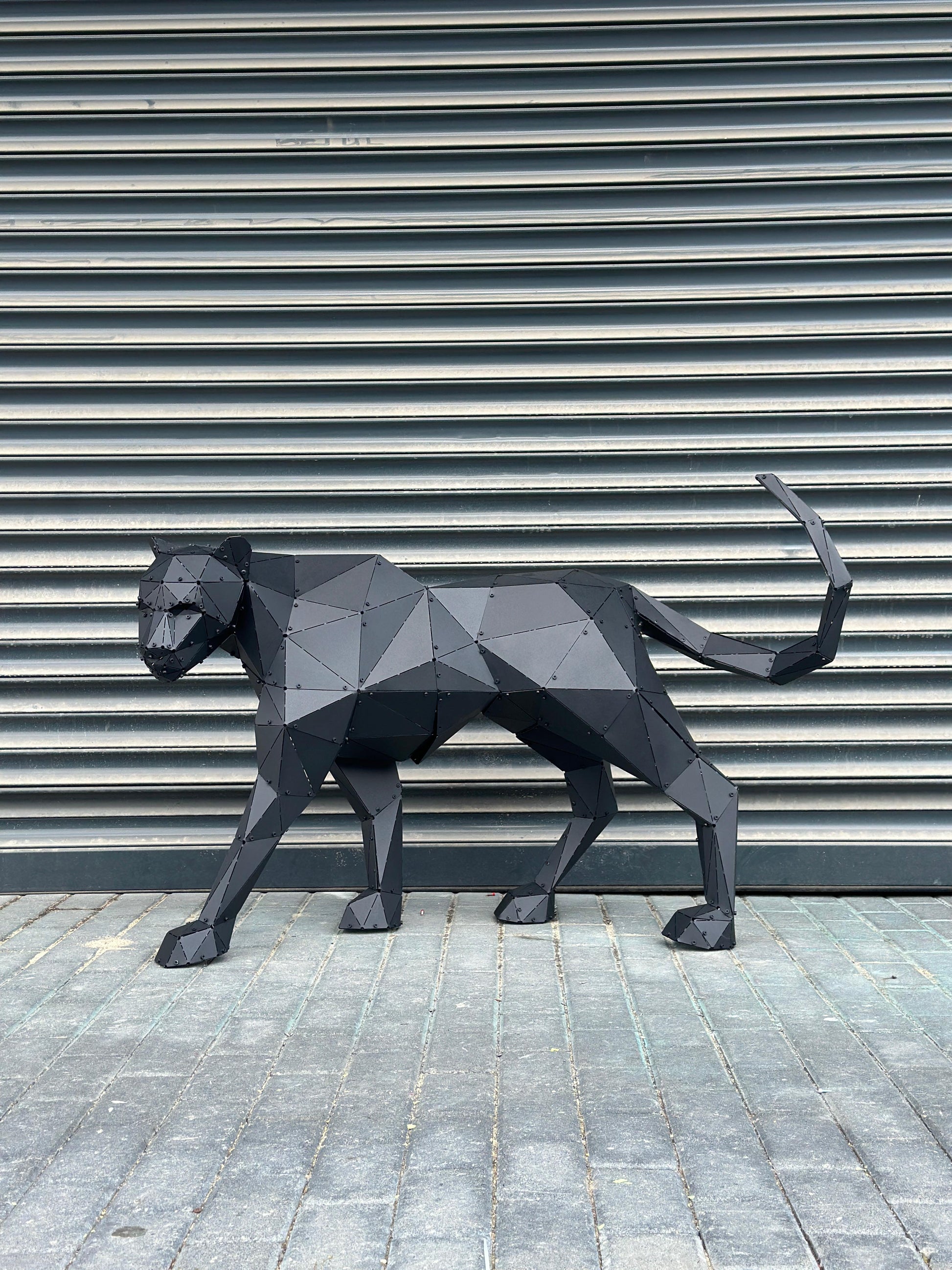 Expert artisans cut and weld each panel with precision. The bold geometry emphasizes the panther’s fierce yet elegant presence, making this sculpture a modern art icon.